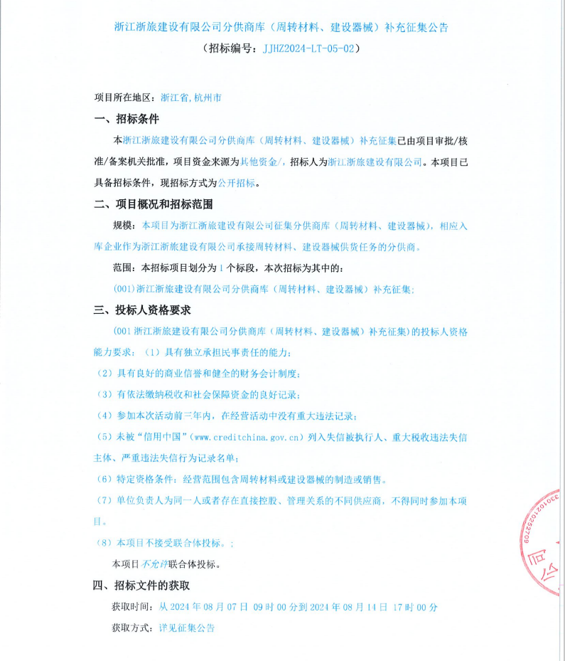 浙江浙旅建設(shè)有限公司分供商庫(周轉(zhuǎn)材料、建設(shè)器械)補(bǔ)充征集公告