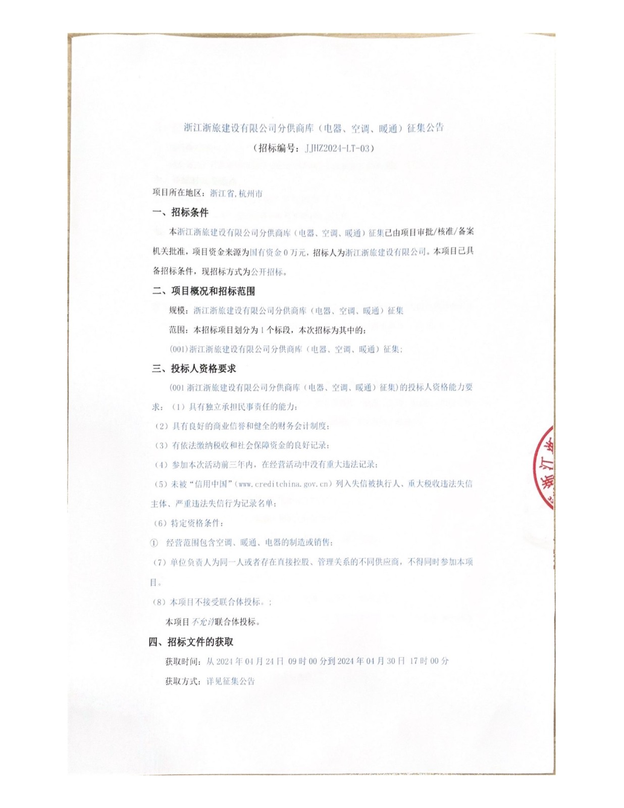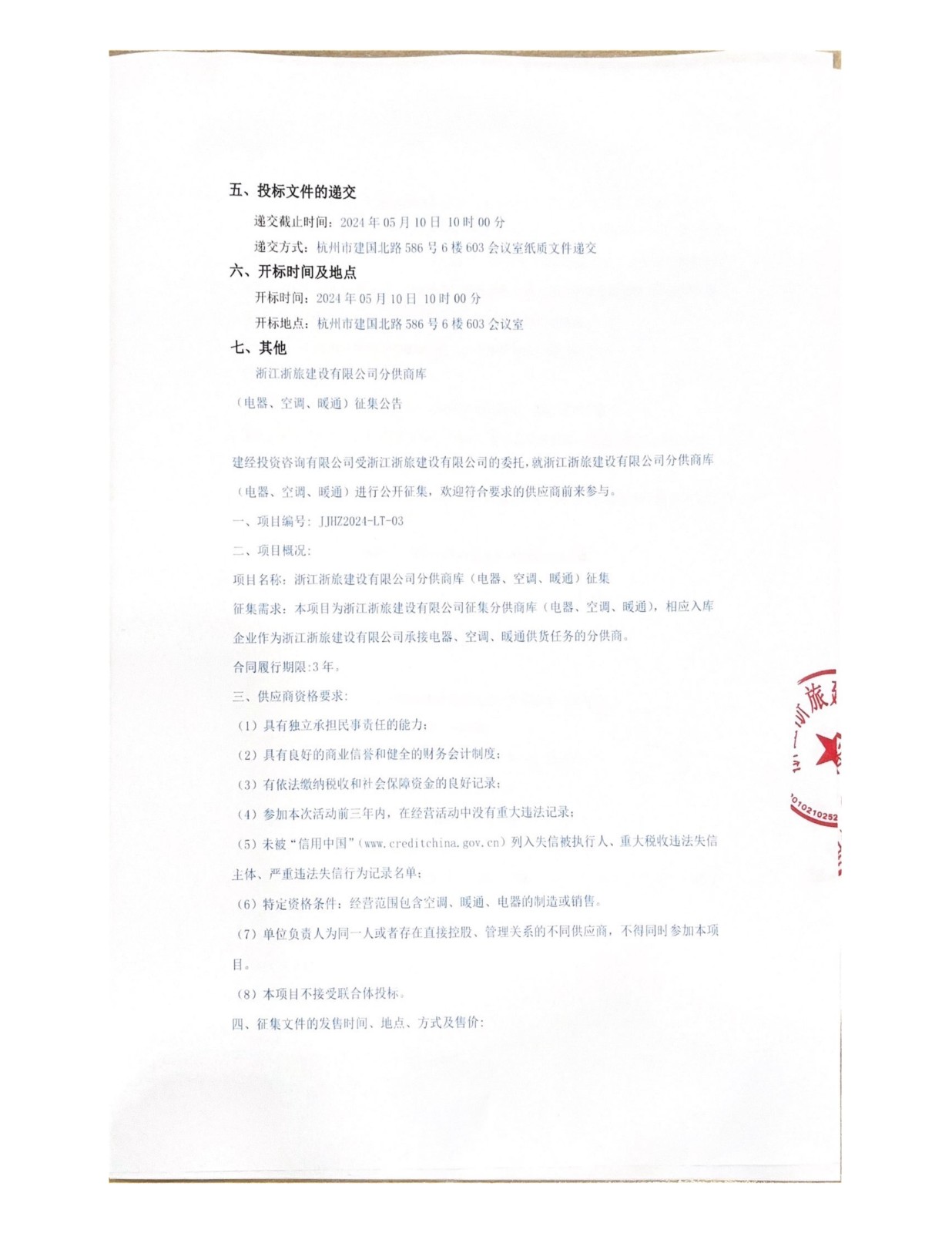 浙江浙旅建設(shè)有限公司分供商庫(電器、空調(diào)、暖通)征集公告