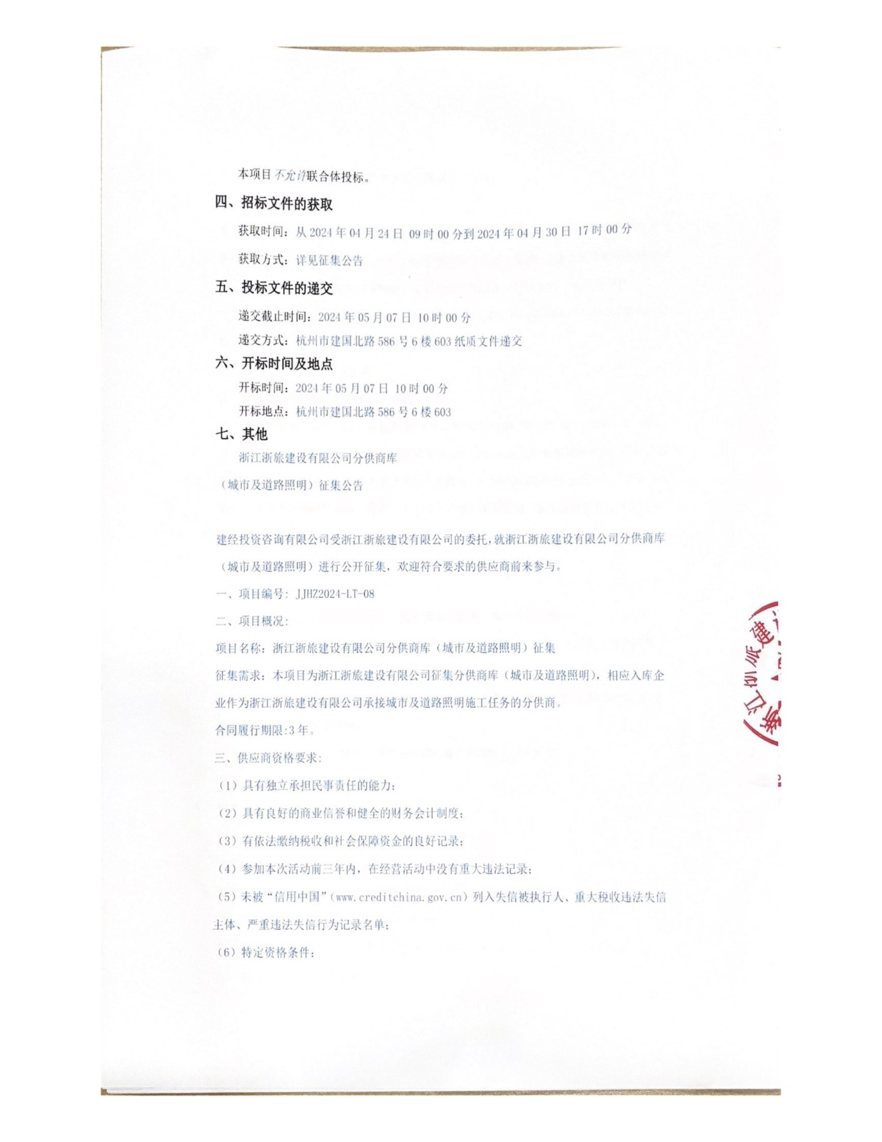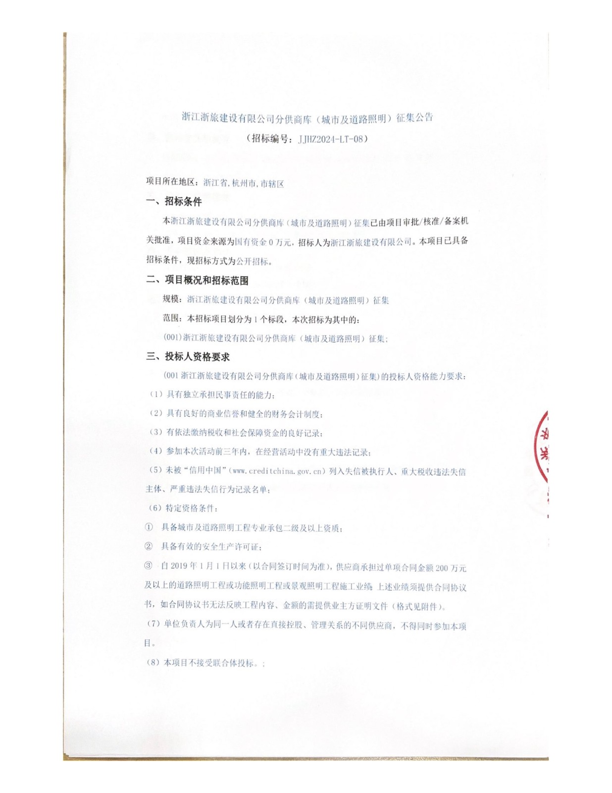 浙江浙旅建設(shè)有限公司分供商庫(城市及道路照明)征集公告
