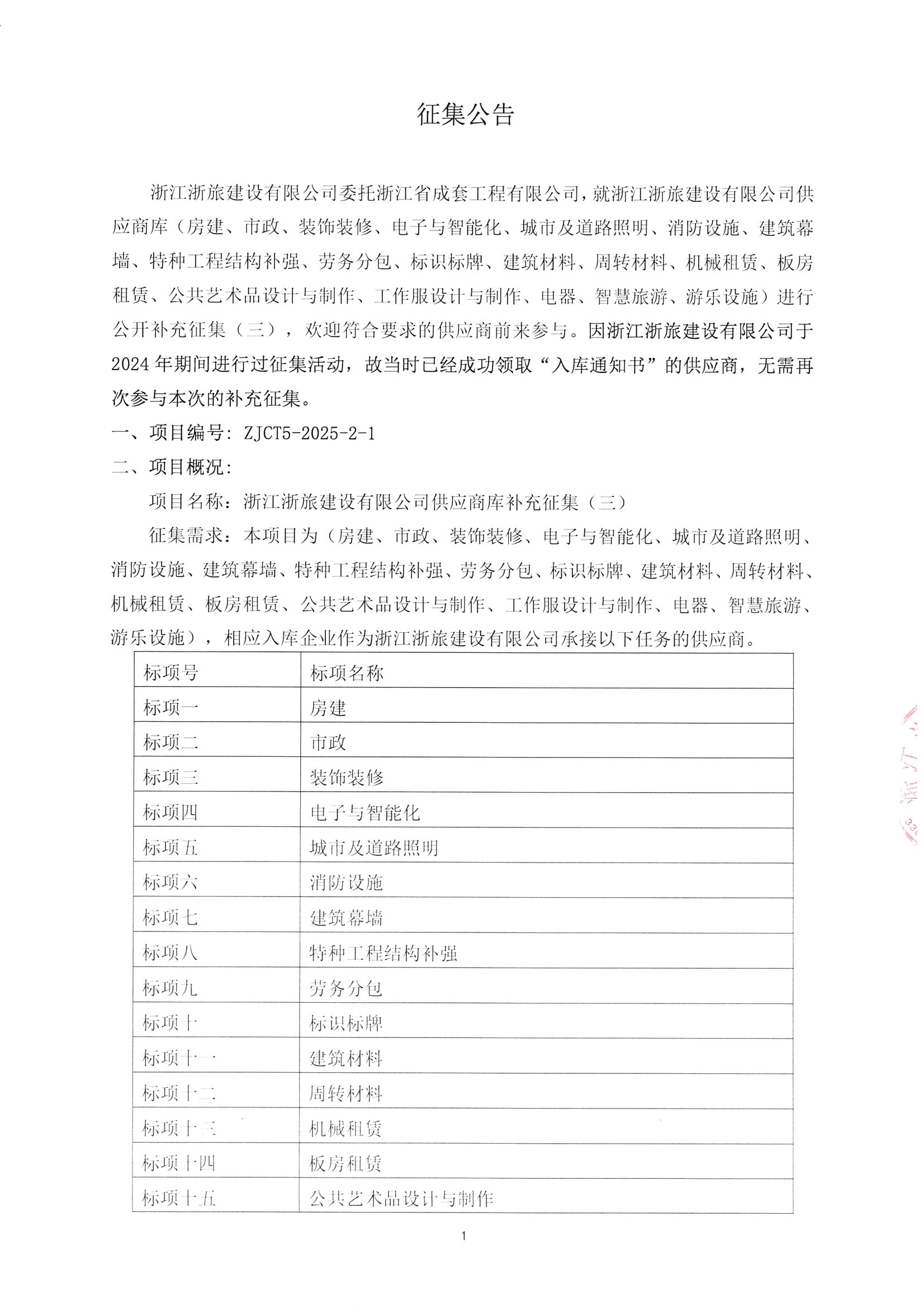 浙江浙旅建設(shè)有限公司供應(yīng)商庫補(bǔ)充征集(二)征集公告